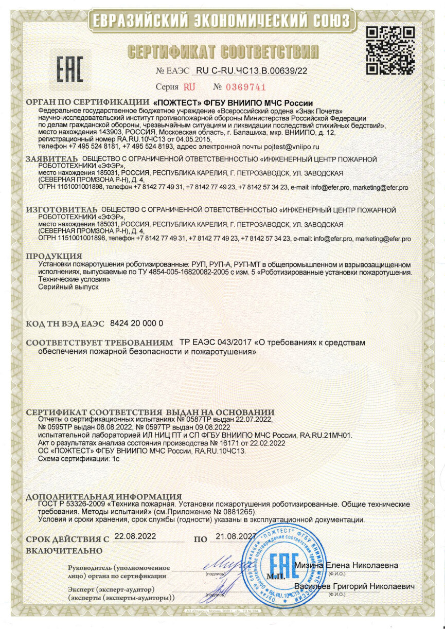 Certificate of Conformity № ЕАЭС RU C-RU.ЧС13.B.00639/22 for robotic fire suppression system