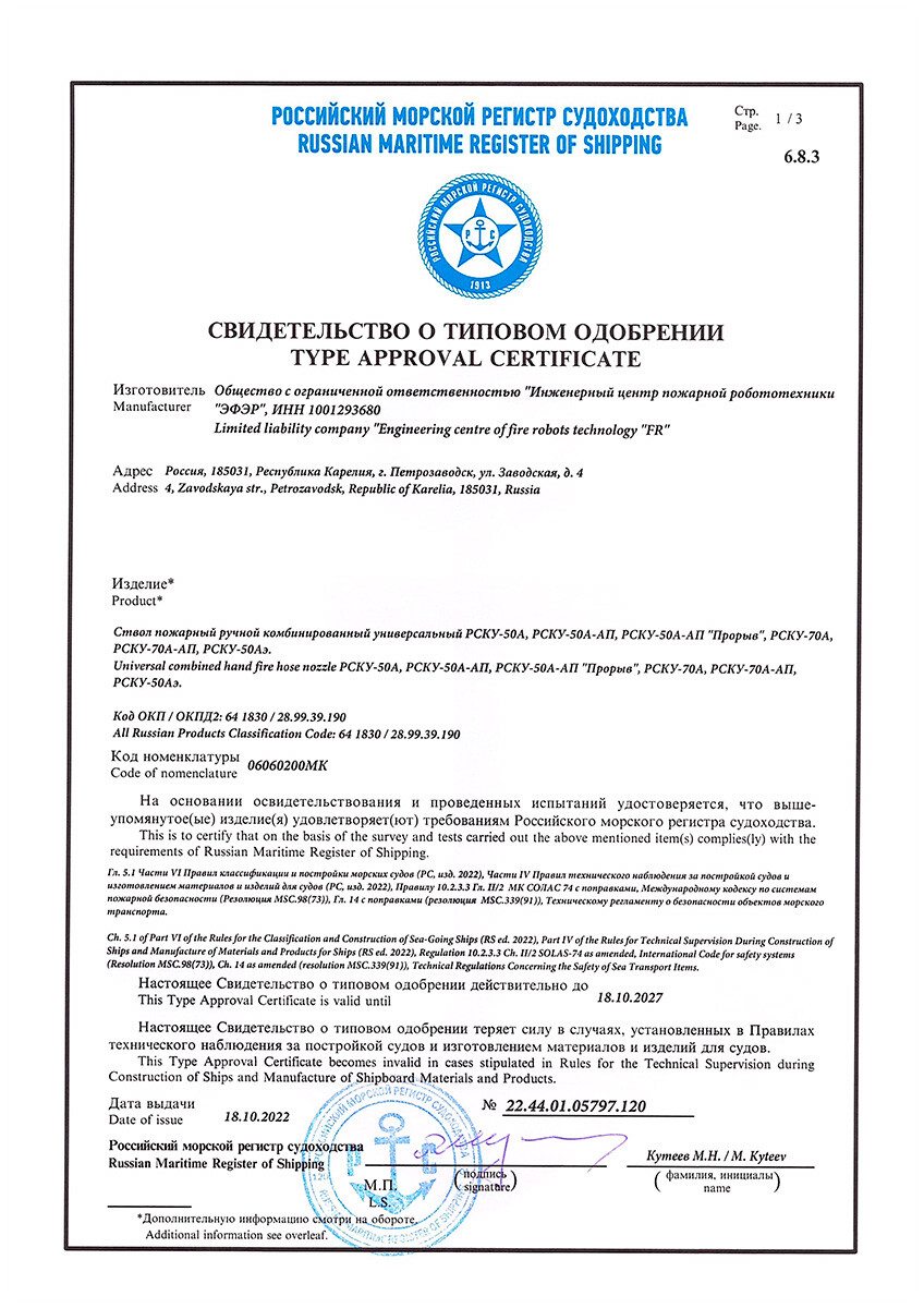Russian maritime register of shipping type approval certificate № 22.44.01.05797.120 for handline nozzles