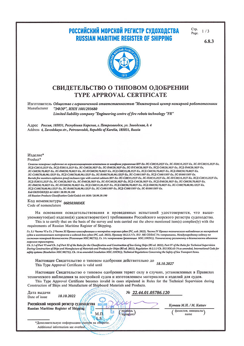 Russian maritime register of shipping type approval certificate № 22.44.01.05786.120 for explosion-proof fire monitors