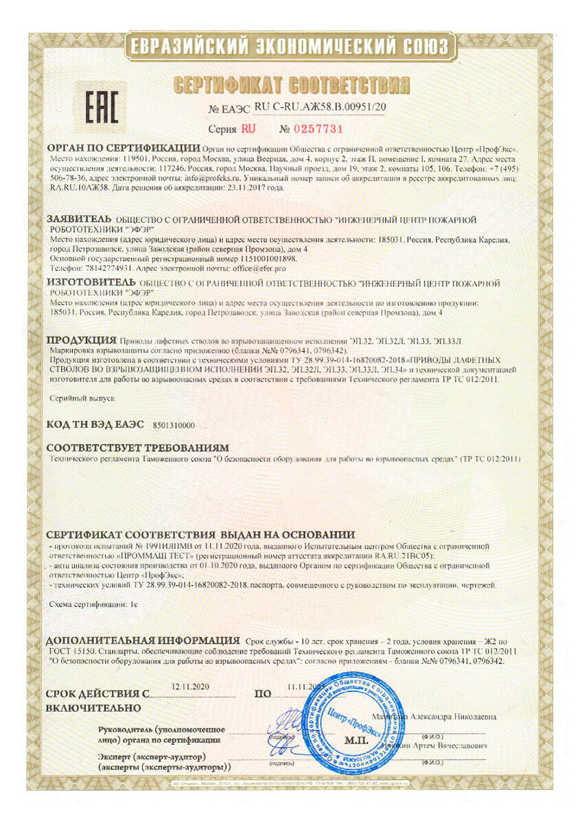 Products: EP.32, EP.32L, EP.33, EP.33L explosion-proof electric drives. Explosion-proof marking is in accordance with the appendix. The products are manufactured in accordance with the Technical specifications TU 28.99.39-014-16820082-2018 "Explosion-proof fire monitor electric drives EDD.32, EDD.32L, D, EDD.33L, EDD.34" and the manufacturer's technical documentation for operation in explosive environment in accordance with the requirements of the Technical regulation TR CU 012/2011. Serial production.