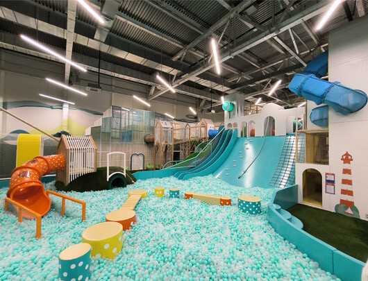 Robotic fire suppression system RFSS-12FR-LSD-S15Ub-IR based on firefighting mini-robots for the protection of retail premises and a family entertainment center.