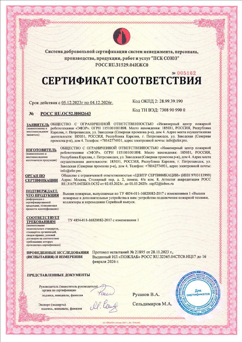 Сертификат соответствия № РОСС RU. ОС52.H002643 на вышки пожарные