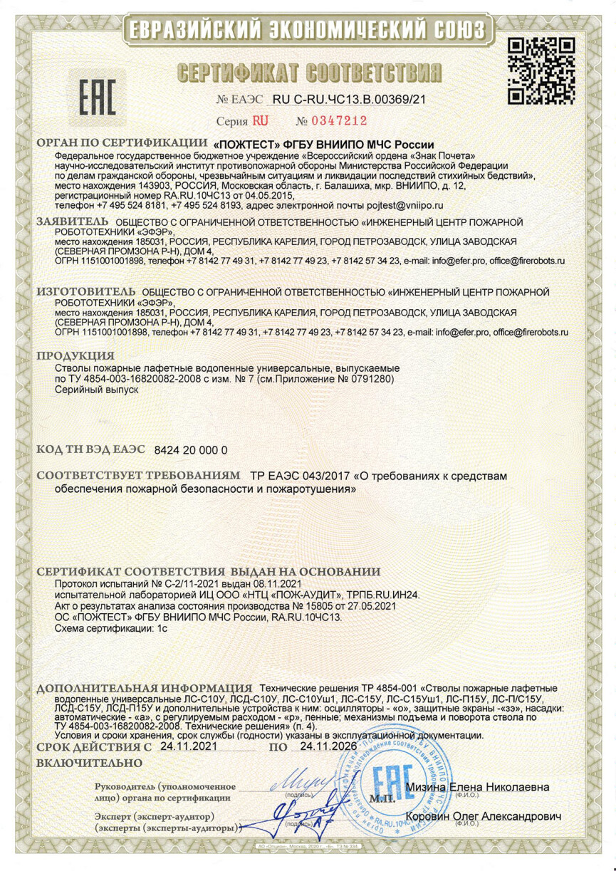 Сертификат соответствия № ЕАЭС RU C-RU.ЧС13.B.00369/21 на стволы лафетные
