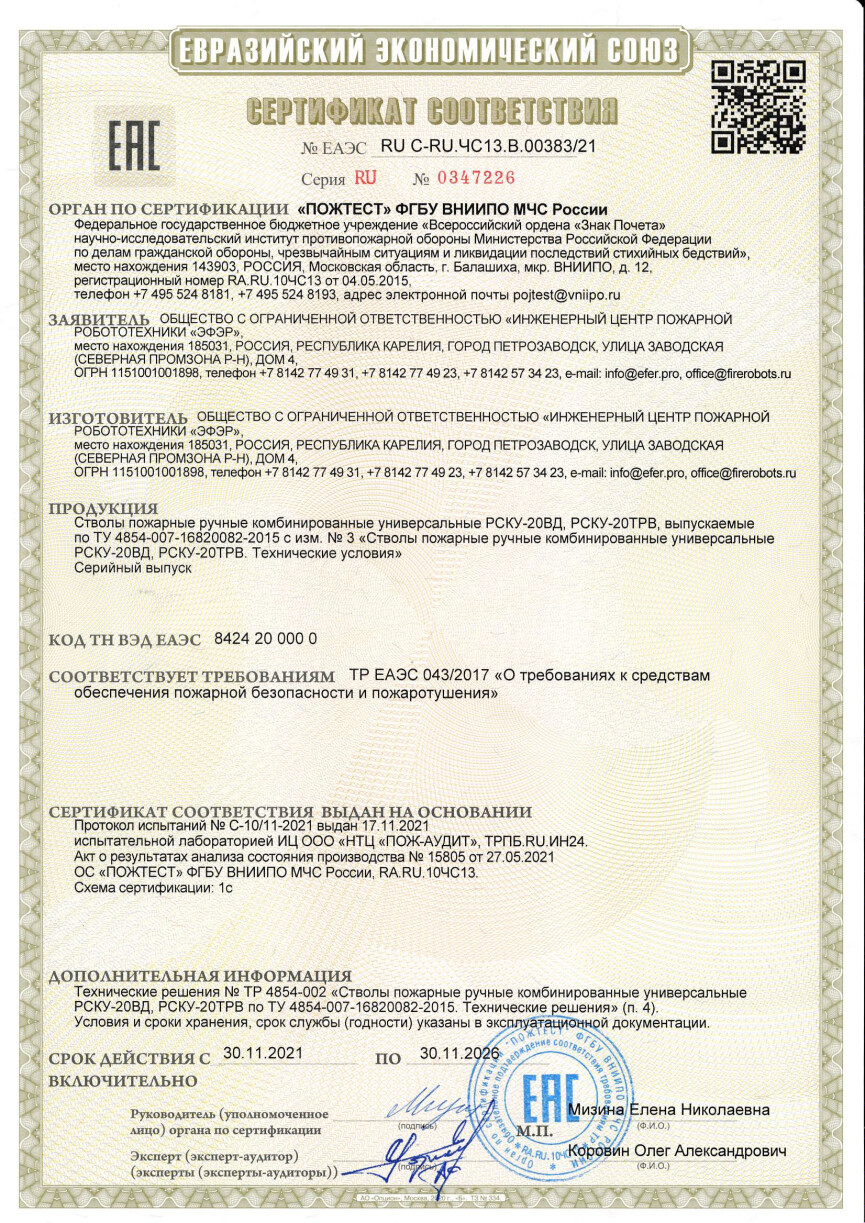 Сертификат соответствия № ЕАЭС RU C-RU.ЧС13.В.00383/21 на ручные стволы