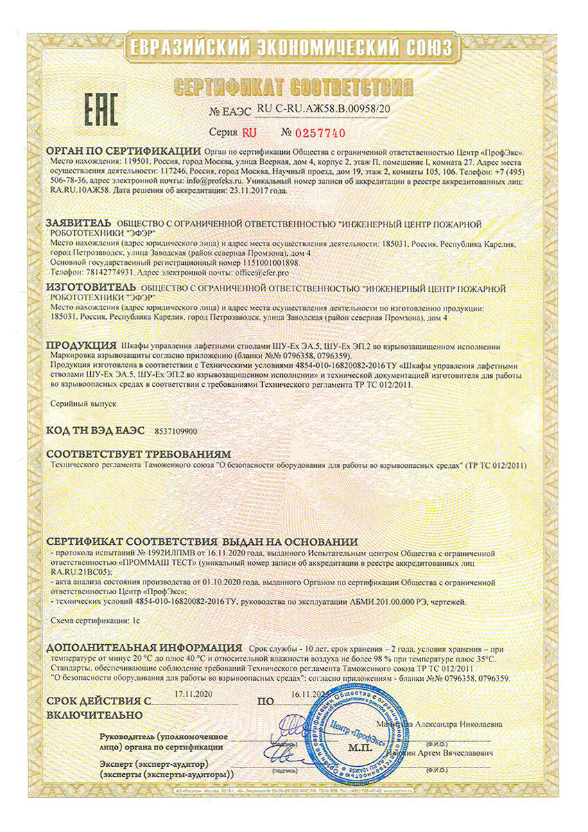 Сертификат соответствия № RU C-RU.АЖ58.В.00958/20 на шкафы управления ШУ-Ех