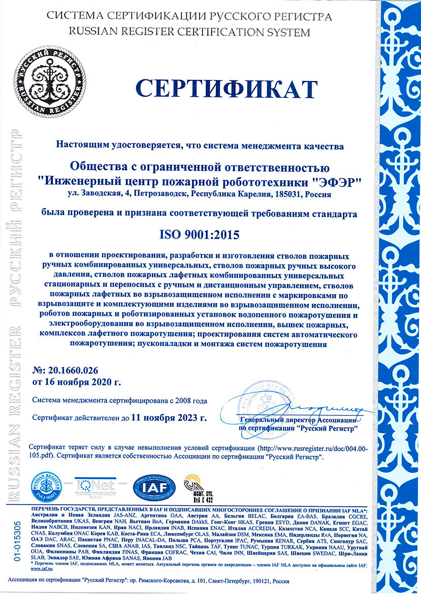 Настоящим удостоверяется, что система менеджмента качества ООО "Инженерный центр пожарной робототехники "ЭФЭР" была проверена и признана соответствующей стандарту ISO 9001:2015 в отношении проектирования, разработки и изготовления стволов пожарных ручных комбинированных универсальных, стволов пожарных ручных высокого давления, стволов пожарных лафетных комбинированных универсальных стационарных и переносных с ручным и дистанционным управлением, стволов пожарных лафетных во взрывозащищенном исполнении с маркировками по взрывозащите и комплектующими изделиями во взрывозащищенном исполнении, роботов пожарных и роботизированных установок водопенного пожаротушения и электрооборудования во взрывозащищенном исполнении, вышек пожарных, комплексов лафетного пожаротушения; проектирования систем автоматического пожаротушения; пусконаладки и монтажа систем пожаротушения.