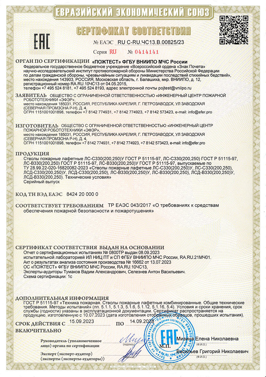 Сертификат соответствия № ЕАЭС RU C-RU.ЧС13.В.00825/23 на лафетные стволы ЛС-С330(200,250)У...