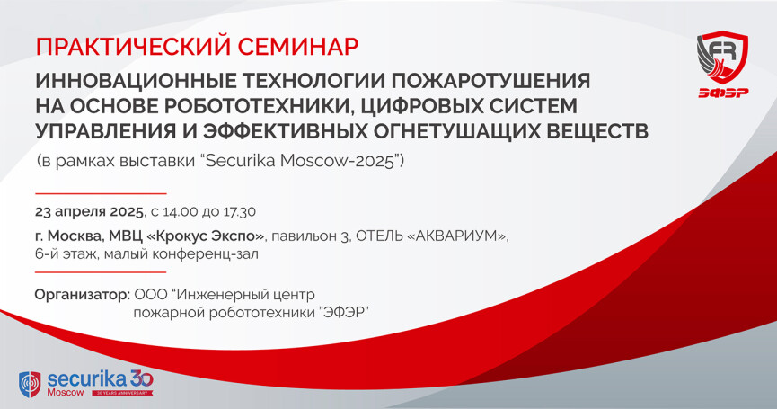Компания "Инженерный центр пожарной робототехники "ЭФЭР" приглашает вас принять участие в практическом семинаре «Инновационные технологии пожаротушения на основе робототехники, цифровых систем управления и эффективных огнетушащих веществ», который будет проводиться в рамках международной выставки «Securika Moscow-2025».